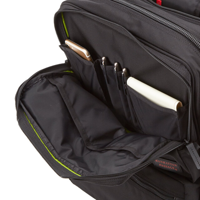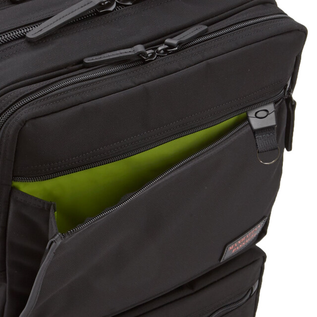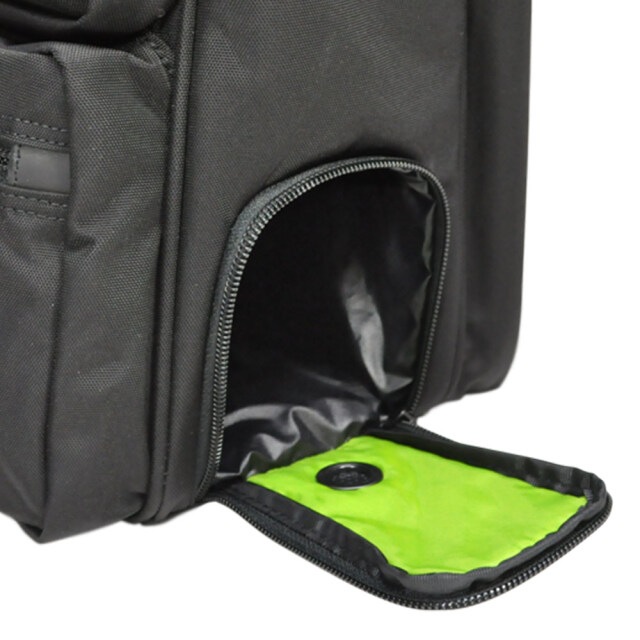 本体下部に外側からアクセス可能な多目的ポケット(撥水仕様で折り畳み傘や水筒等を入れるのに便利)